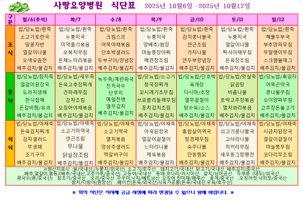 사랑요양병원 10월 둘째주 식단표
