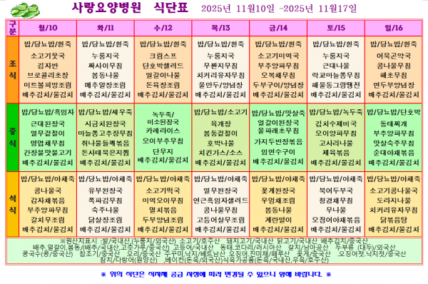 사랑요양병원 11월 둘째주 식단표