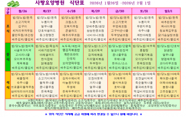 사랑요양병원 1월 넷째주 식단표